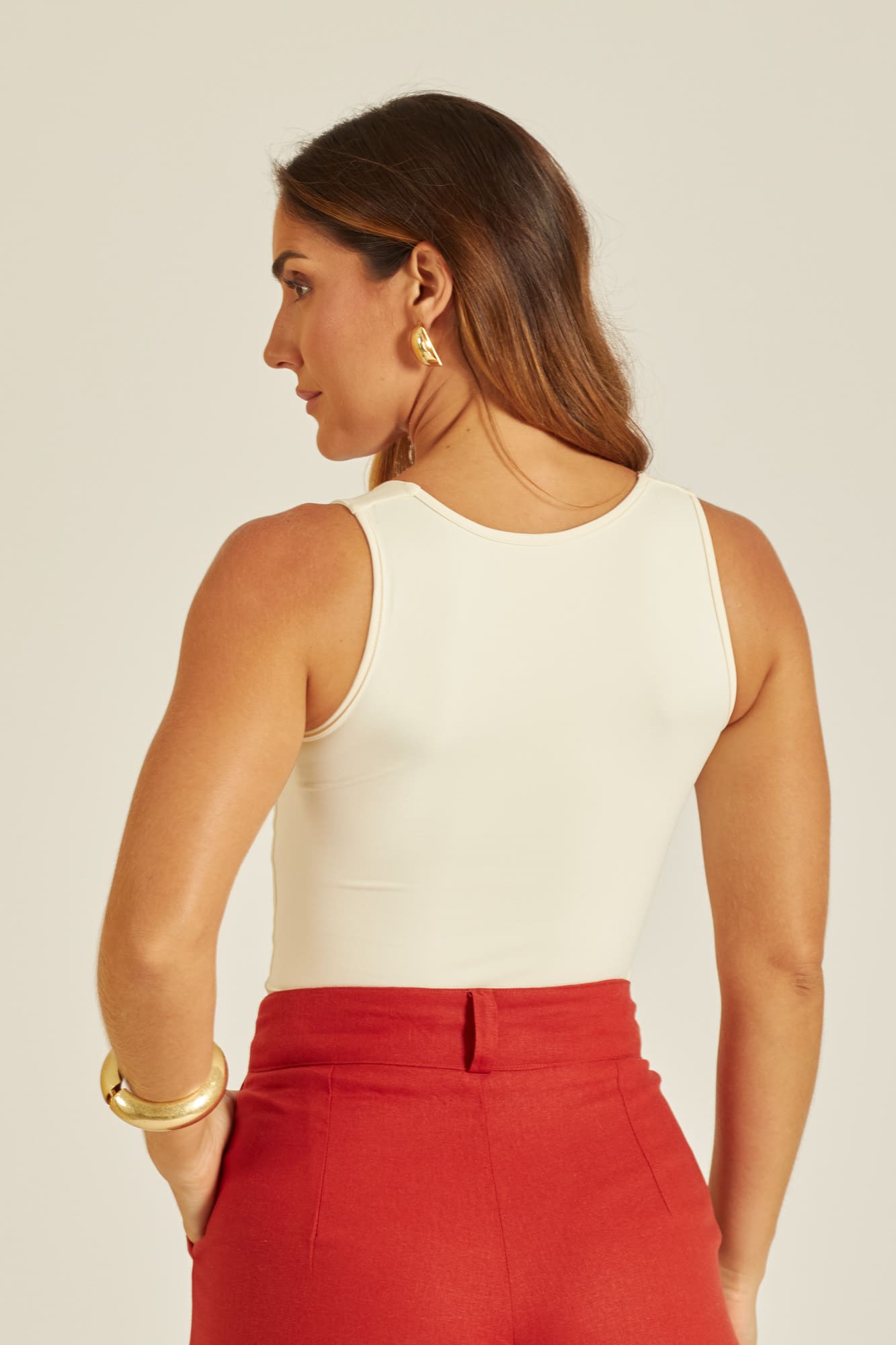 Nossa regata em malha de poliamida é aquele básico nada básico que eleva qualquer look. Confeccionada em um tecido leve, macio e de toque fresco, ela é perfeita para os dias mais quentes do verão.