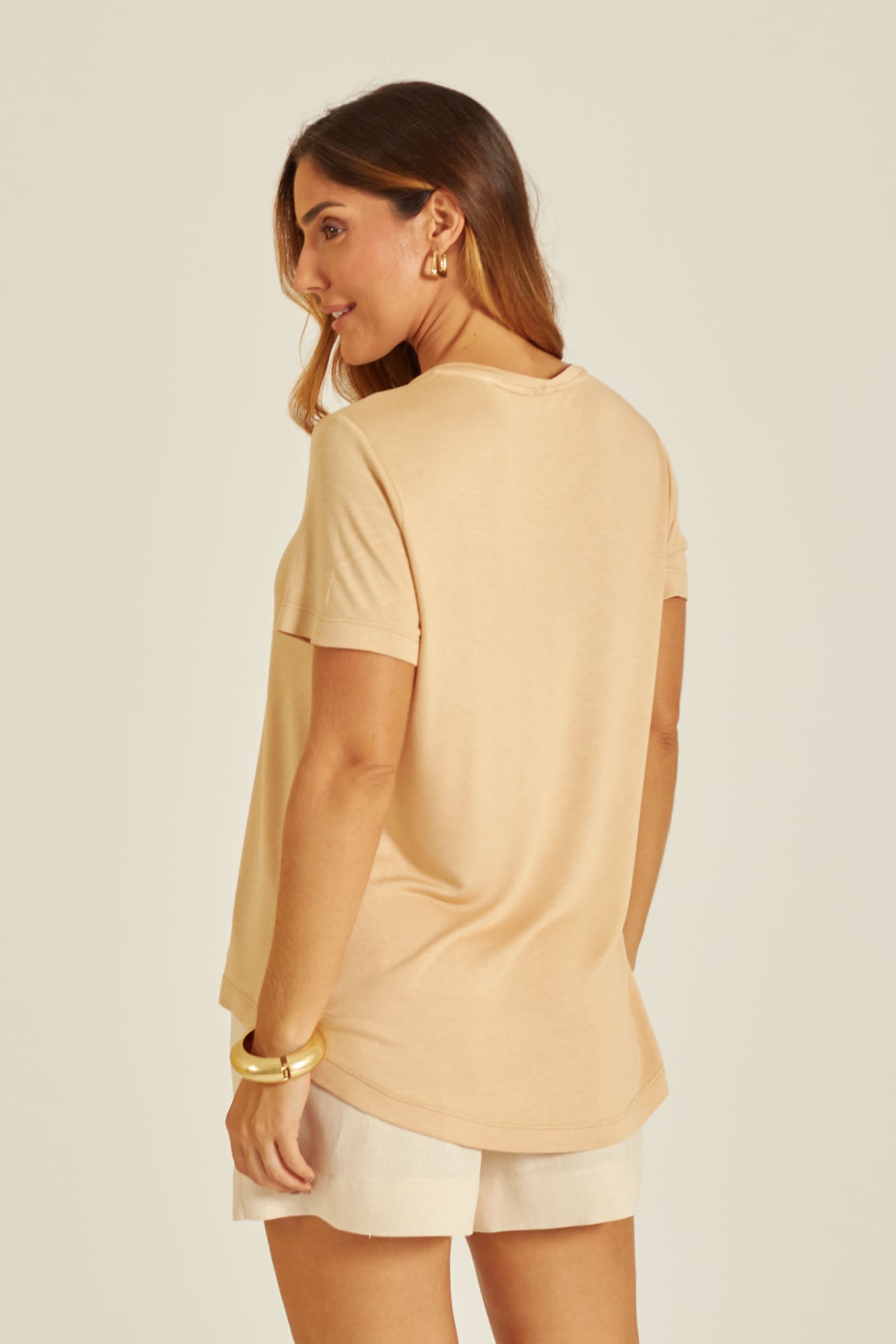 O modelo possui decote redonda, mangas curtas e barra posterior levemente alongada, garantindo um visual moderno e versátil.