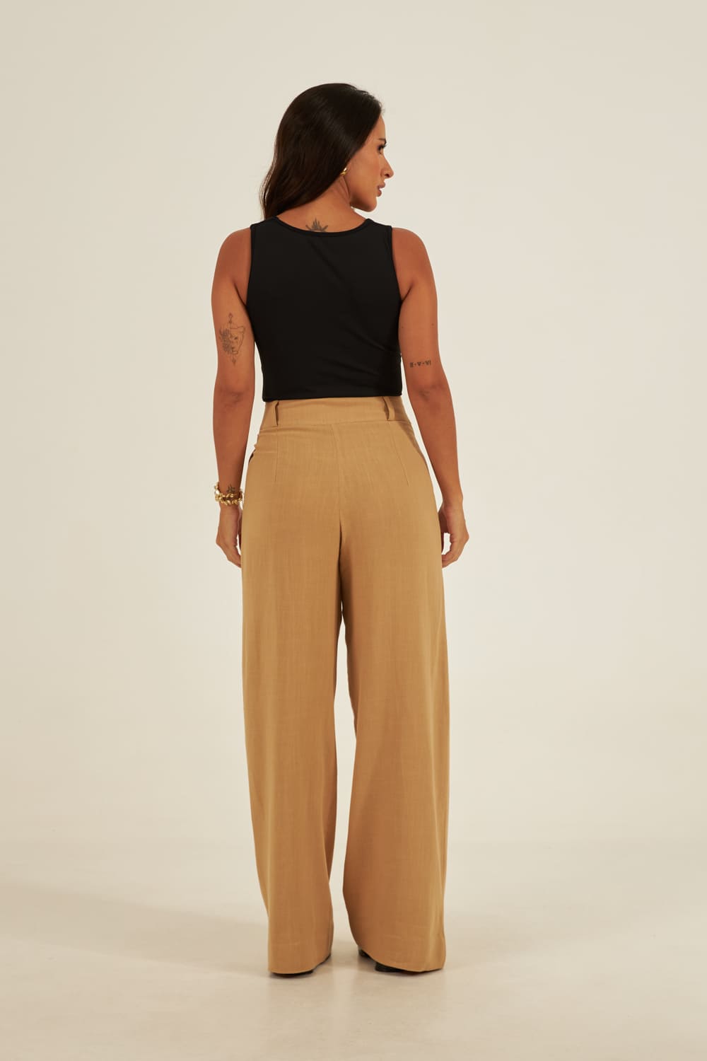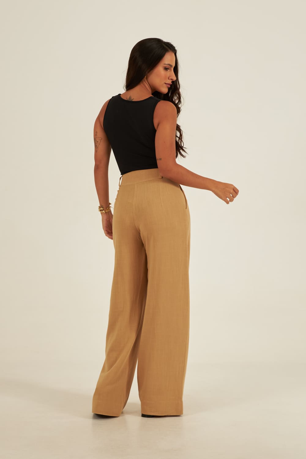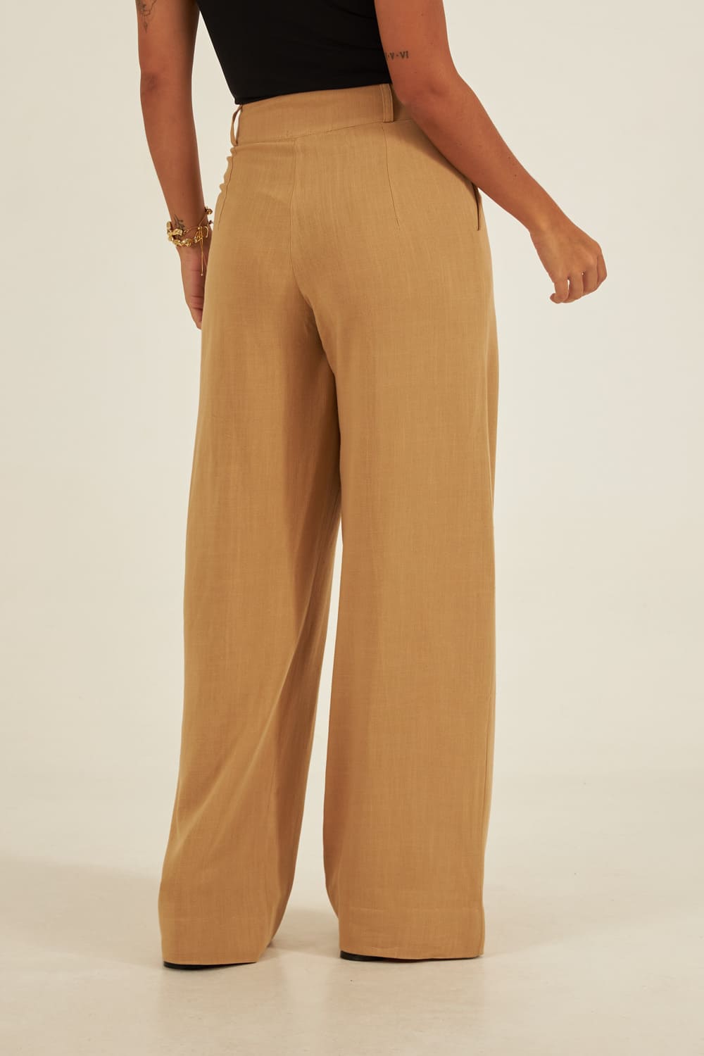 Calça confeccionada em tecido de fios de linho e viscose. Possui vinco na parte frontal, modelagem e acabamento de alta qualidade.