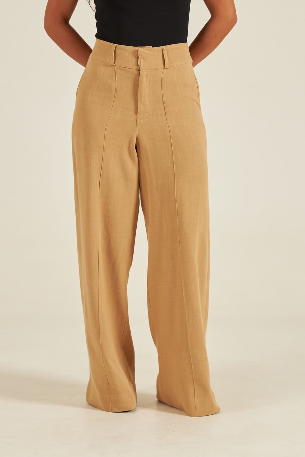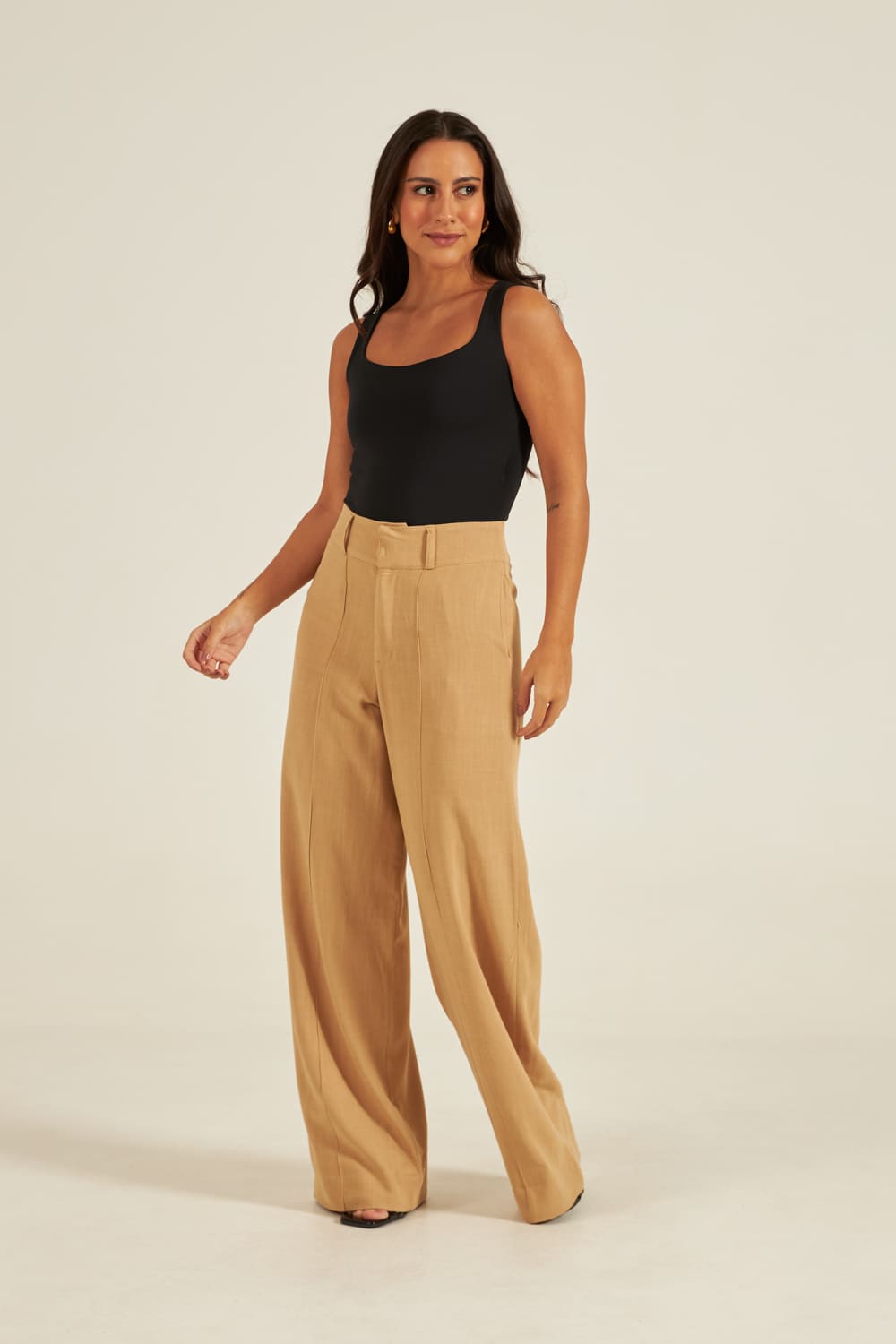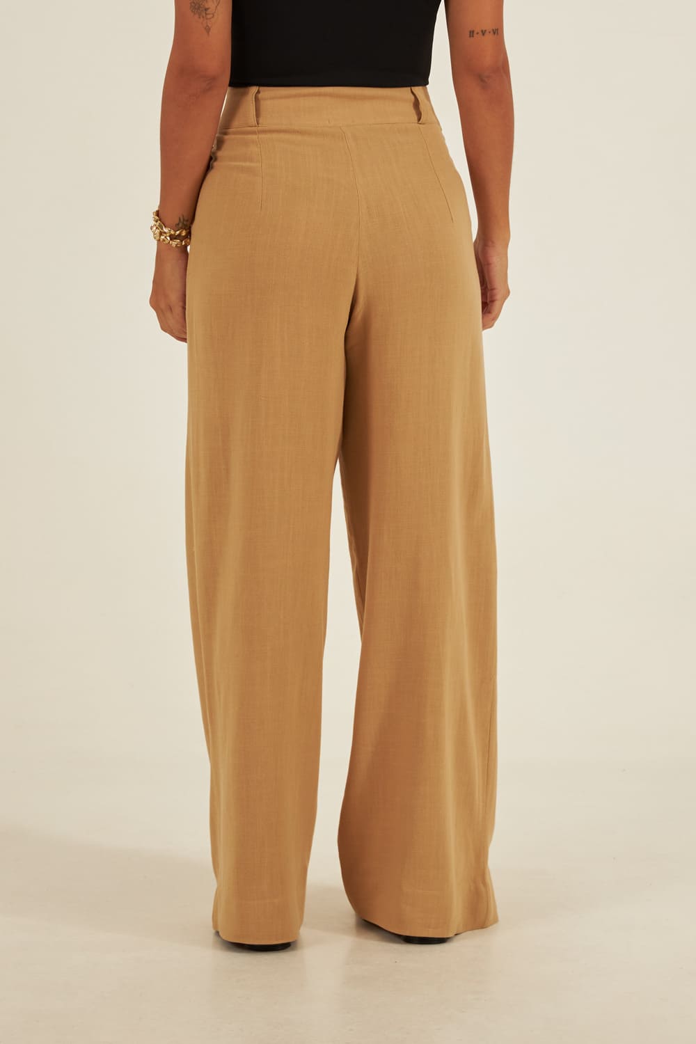 Calça confeccionada em tecido de fios de linho e viscose. Possui vinco na parte frontal, modelagem e acabamento de alta qualidade.