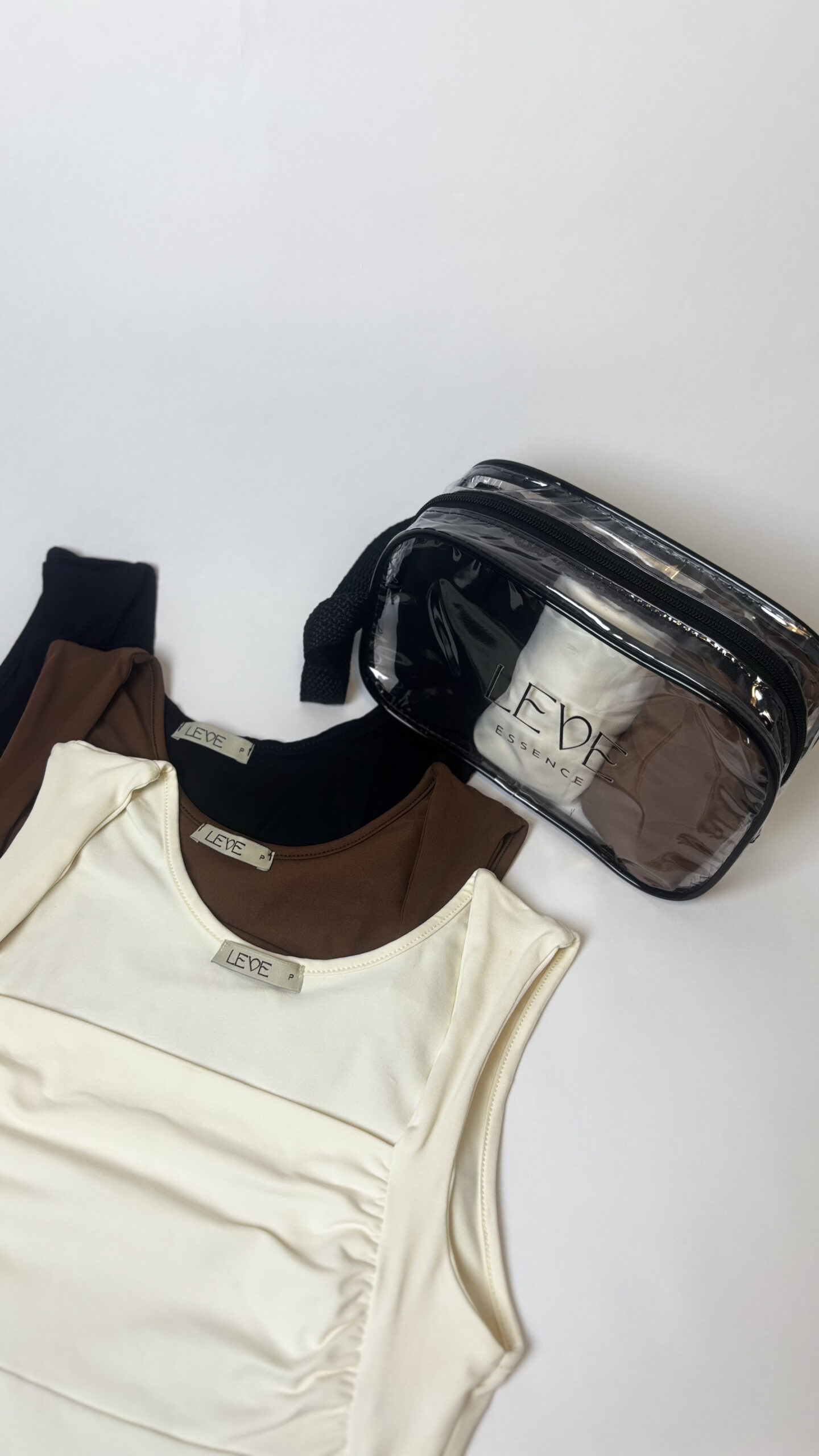 São 3 blusas em tons neutros, confeccionadas em malha de poliamida, com caimento impecável e toque leve que se adapta ao corpo sem perder o conforto.
