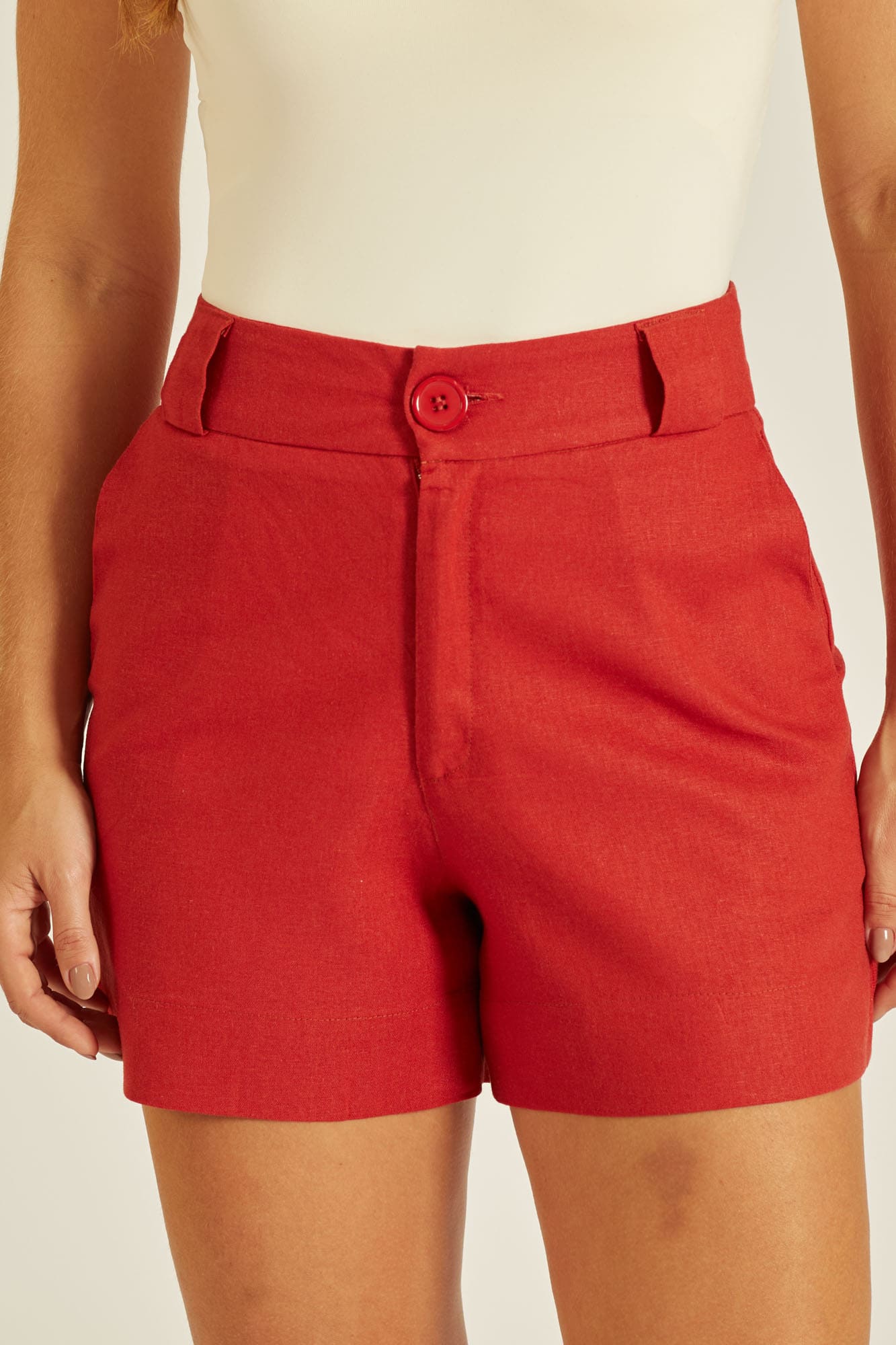 Short confeccionado em tecido de fios de linho e viscose. Com modelagem elegante e acabamento de alta qualidade, possui bolsos faca e botões tingidos na cor do tecido.