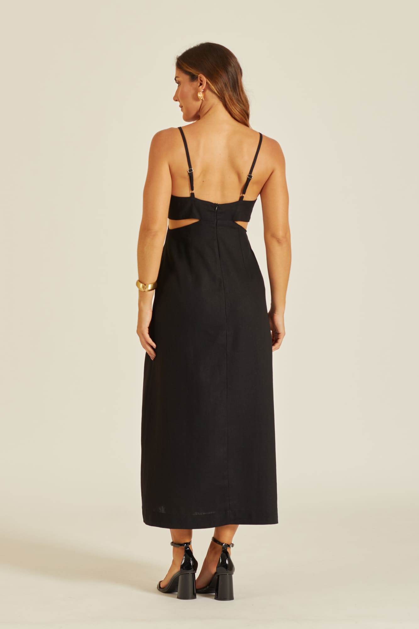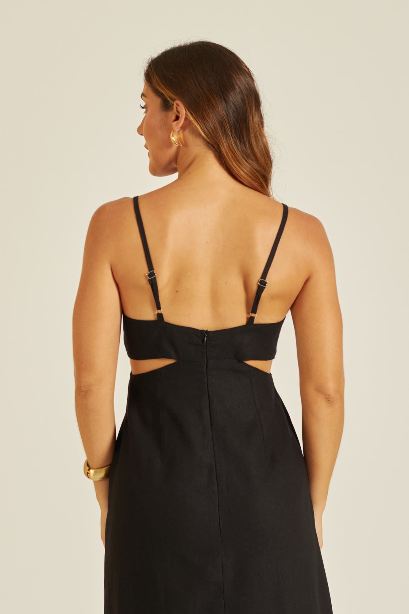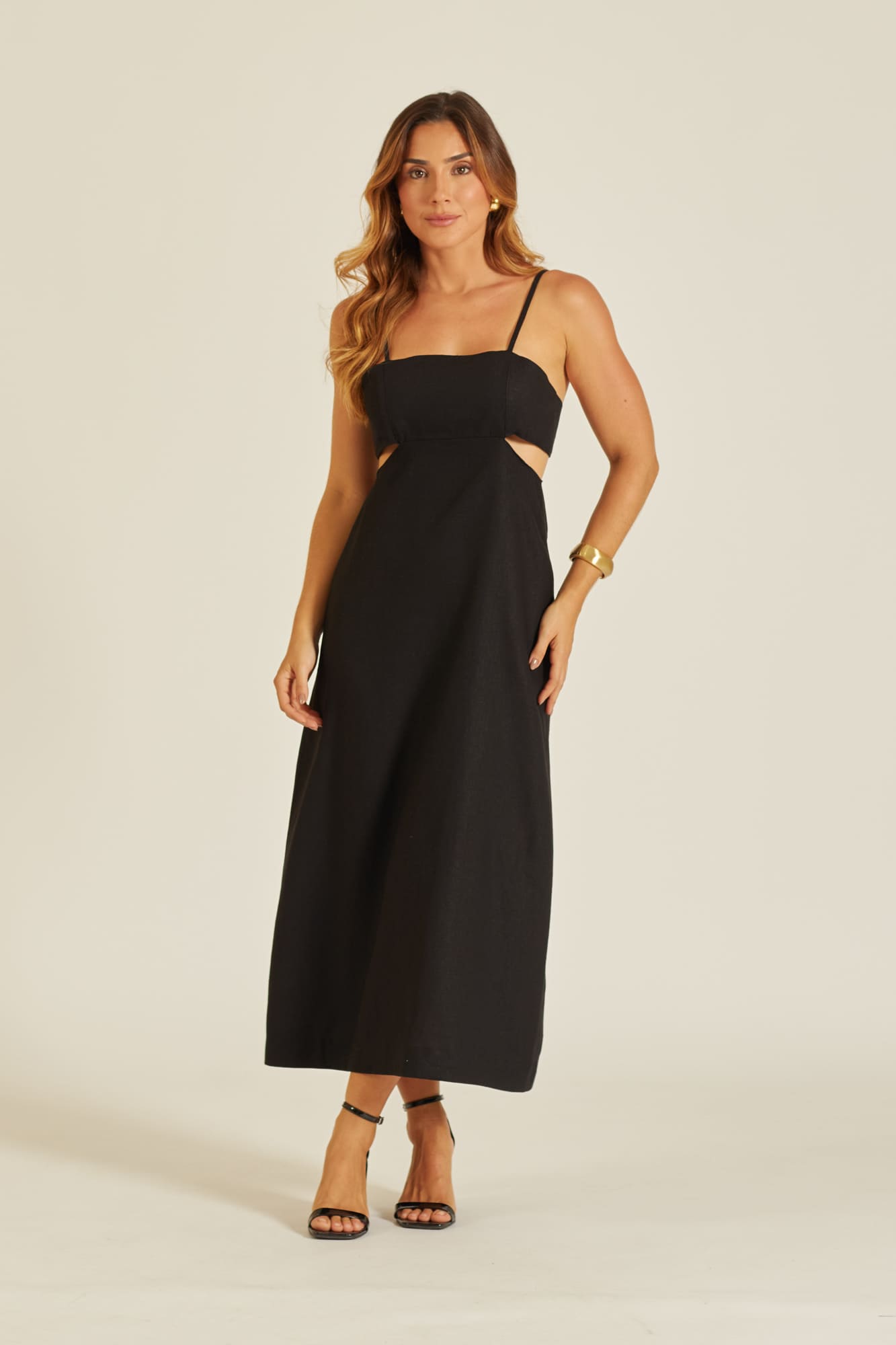 Possui comprimento midi, alças finas reguláveis, decote reto e detalhe vazado na cintura.