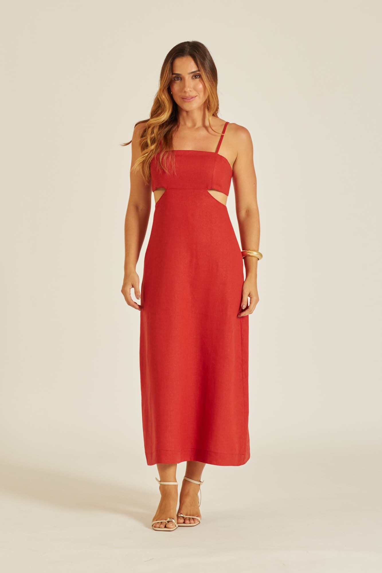 Possui comprimento midi, alças finas reguláveis, decote reto e detalhe vazado na cintura.